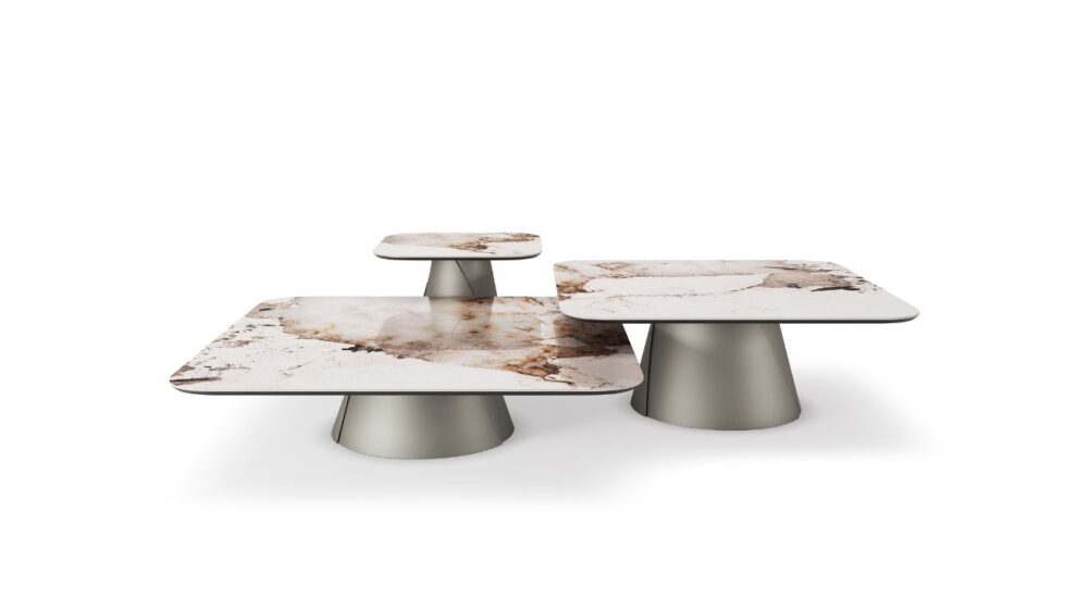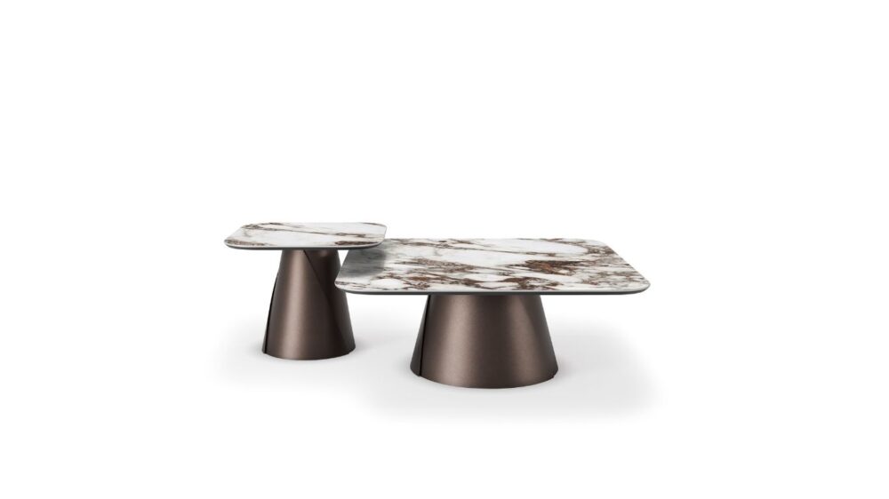 Az Albert dohányzóasztalok egyik legmeghatározóbb eleme a kúpos fém talp, amelyet Giorgio Cattelan tervezett. Bár első pillantásra robusztusnak tűnhet, a két ferde, egymást átfedő acéllemezre emlékeztető részletnek köszönhetően vizuálisan mégis karcsú és könnyed. Ez a finom ellentét teszi az Albert kollekciót egyszerre szoborszerűvé és visszafogottan elegánssá. A láb háromféle színben választható matt bronz, titán és gyöngyház.
