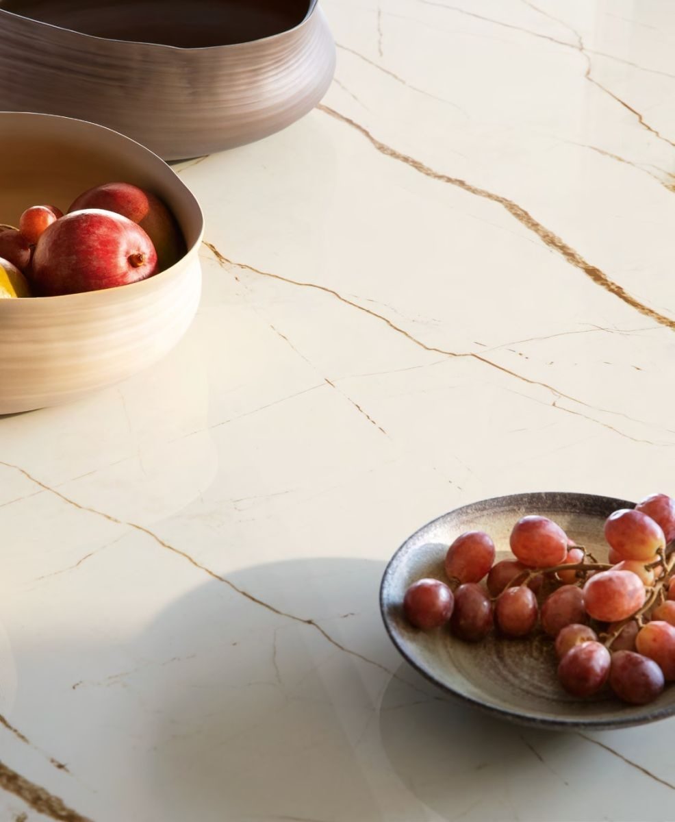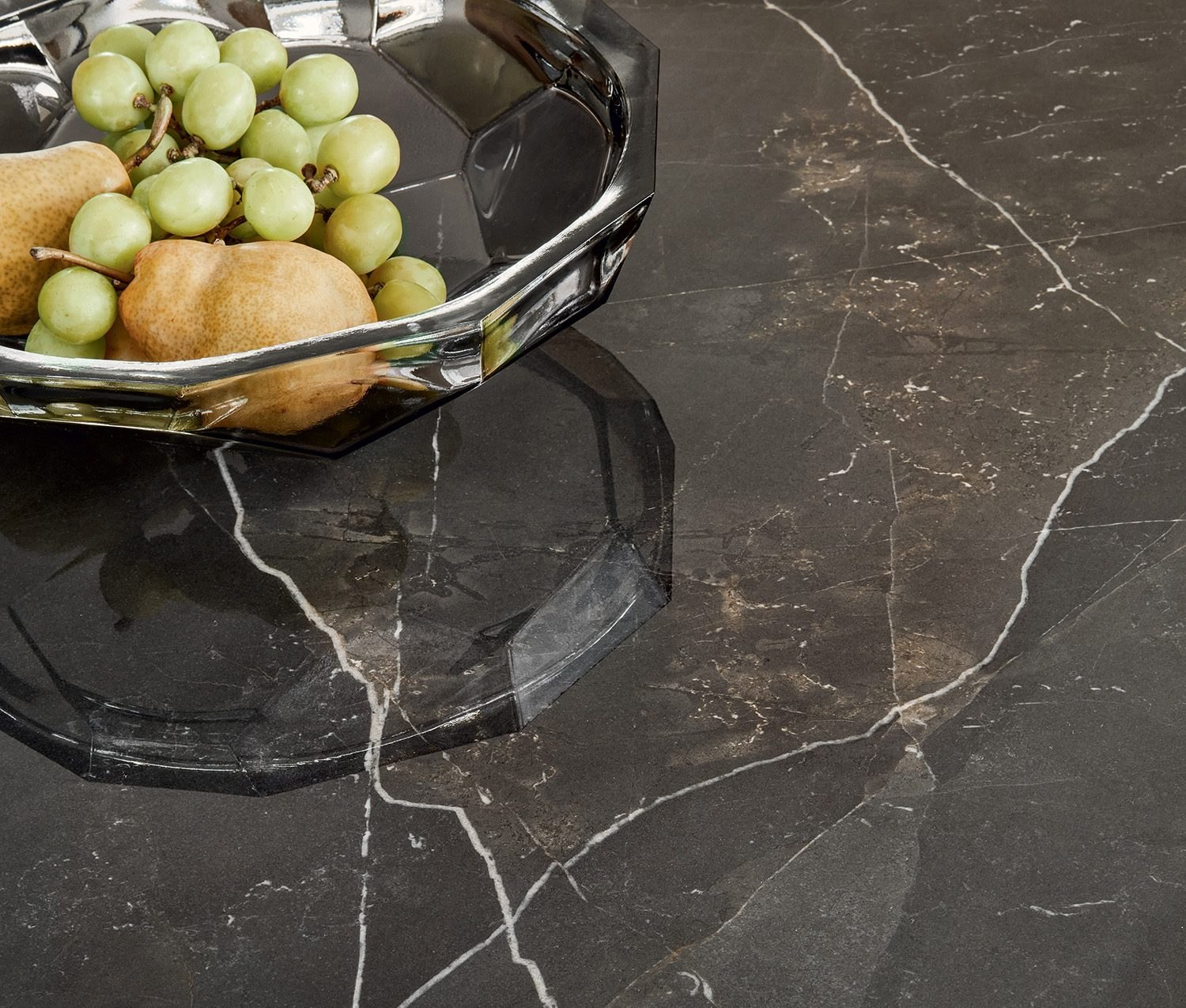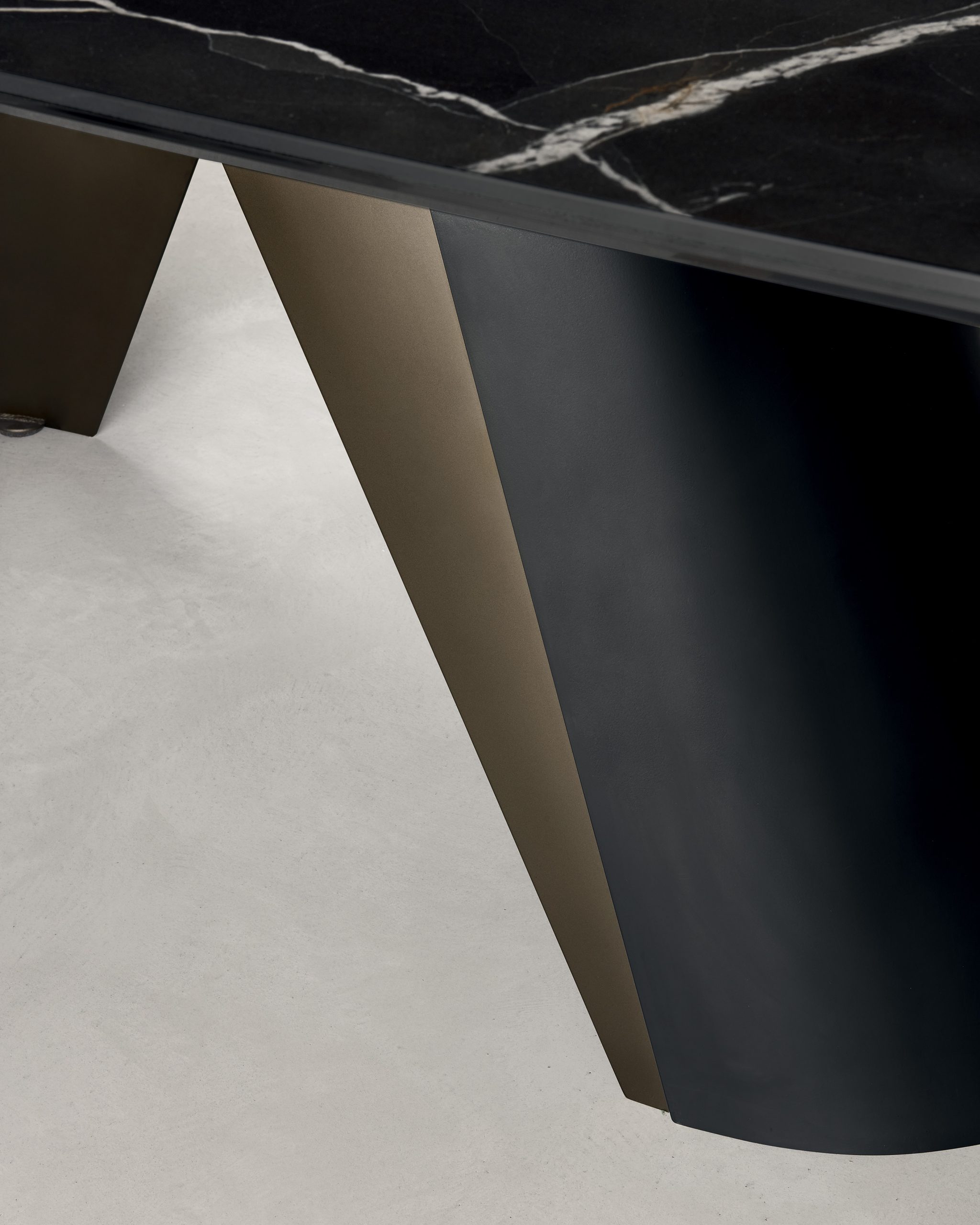 Az asztallap széle különleges, a talp árnyalatára reflektáló kialakítást kapott. A dupla fémlemez borítás finoman csillog, visszaveri a fényt, és megvilágítja azt a területet, amely normál esetben árnyékban maradna. Ez a gondosan megtervezett részlet tovább erősíti az Apian eleganciáját, miközben egyedi atmoszférát teremt az étkezőben. A láb fekete, fekete-bronz, fehér és fehér-bronz színekben kérhető.