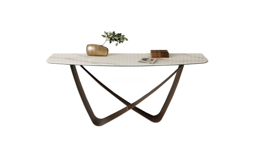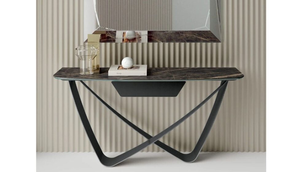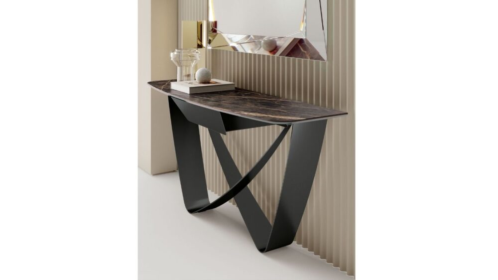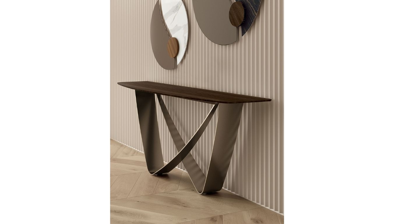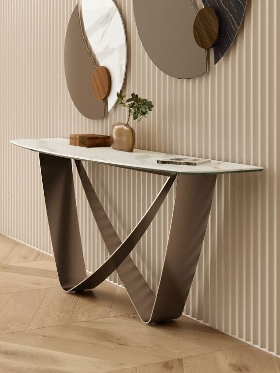 A Bontempi Casa BACH konzolasztala az időtlen kifinomultság modern manifesztációja. A két, egymást metsző fém elem aszimmetrikus végtelen jelre emlékeztető szoborszerű formát alkot, amely az előszobát vagy a nappali átmeneti tereit azonnal magasabb esztétikai szintre emeli. Karcsú sziluettje légies megjelenést biztosít, miközben elegáns, karakteres fókuszponttá válik bármely enteriőrben.