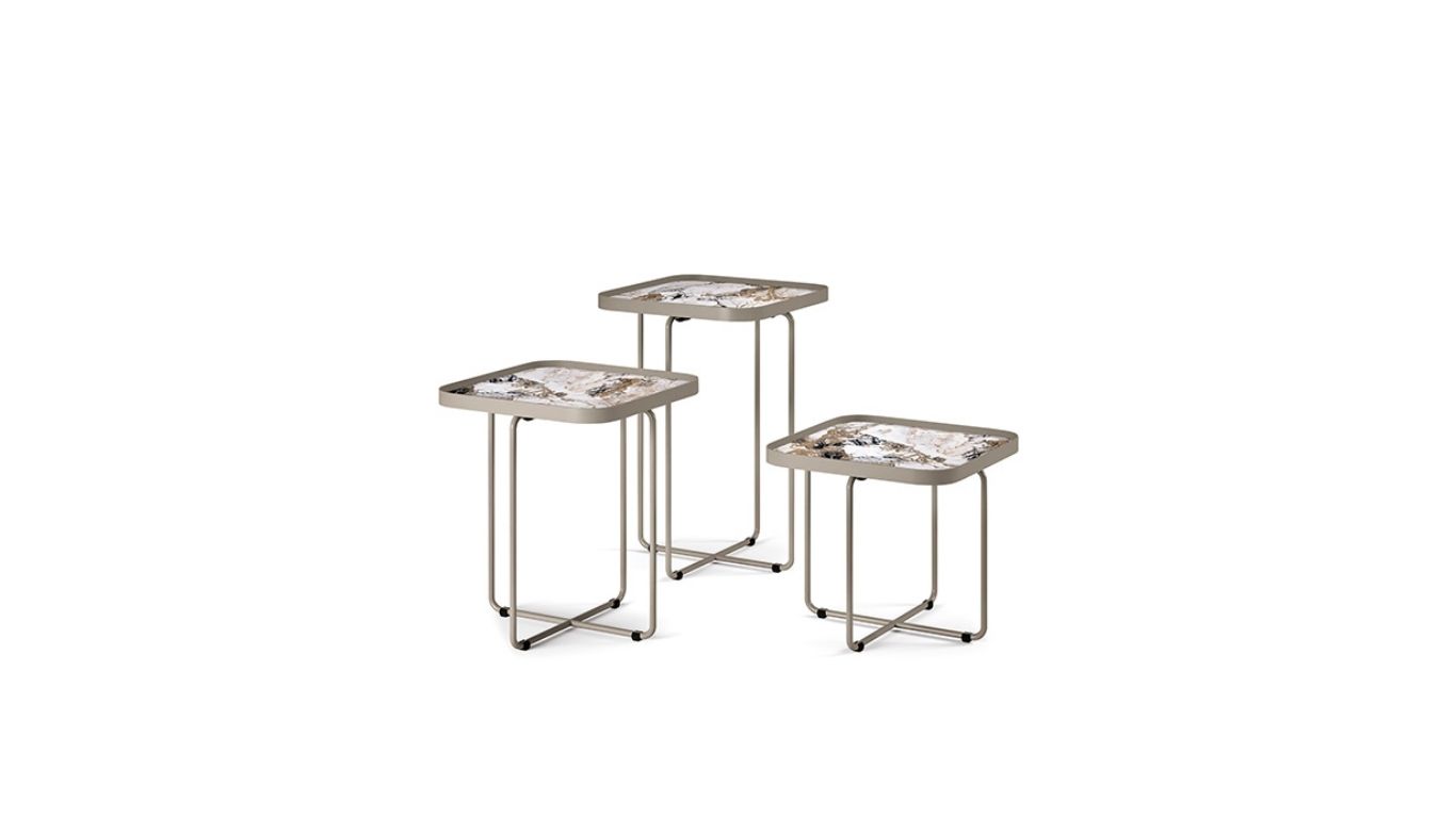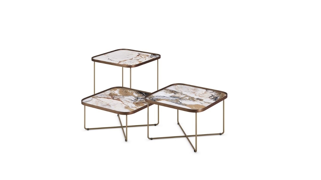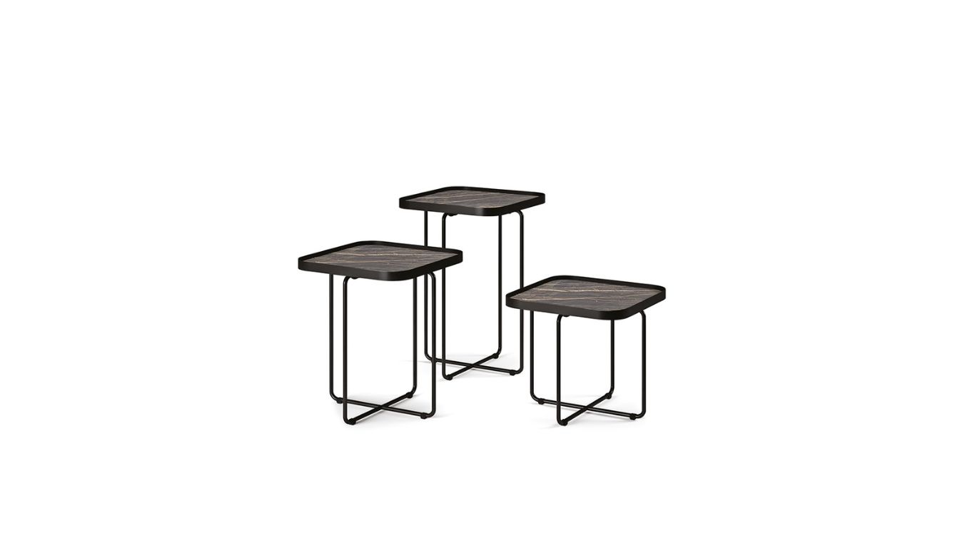 Az asztalok ikonikus eleme az X‑alakú fémláb, amely vizuális könnyedséget ad, mégis erőteljes grafikai jelenléttel bír. Ezek a lábak különösen jól érvényesülnek, amikor a különböző magasságú és méretű modellek egymás mellé kerülnek: a több szintből felépülő kompozíció dinamikus ritmust és rétegzettséget visz a nappaliba.