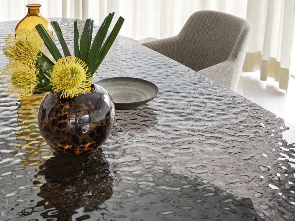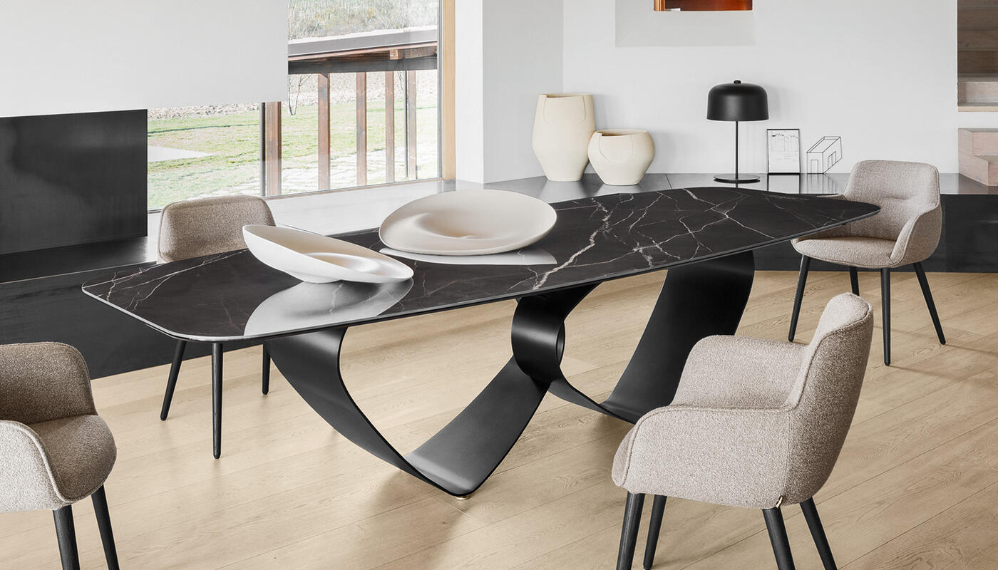 A modell tervezését Turi Simeti „ellipszis” művei inspirálták. Az asztal különleges formanyelve optikai illúziót teremt: a síkból induló, kétdimenziós elemek egymásba fonódnak, majd finom, geometrikus mintázattá állnak össze. A monokróm felület visszaveri a fényt, amely nézőponttól függően folyamatosan változik—így a Breeze minden oldalról új vizuális élményt nyújt.