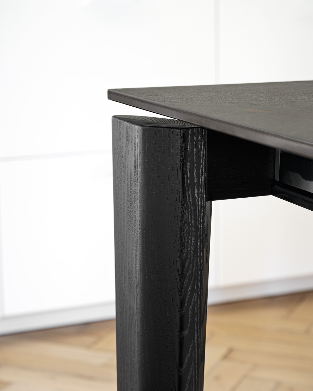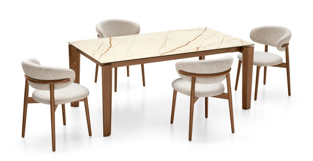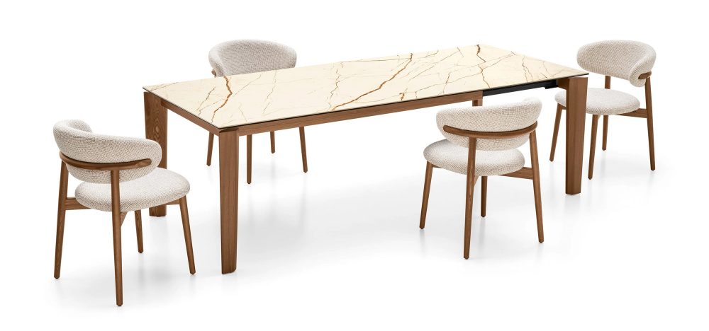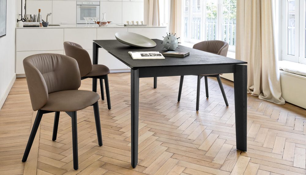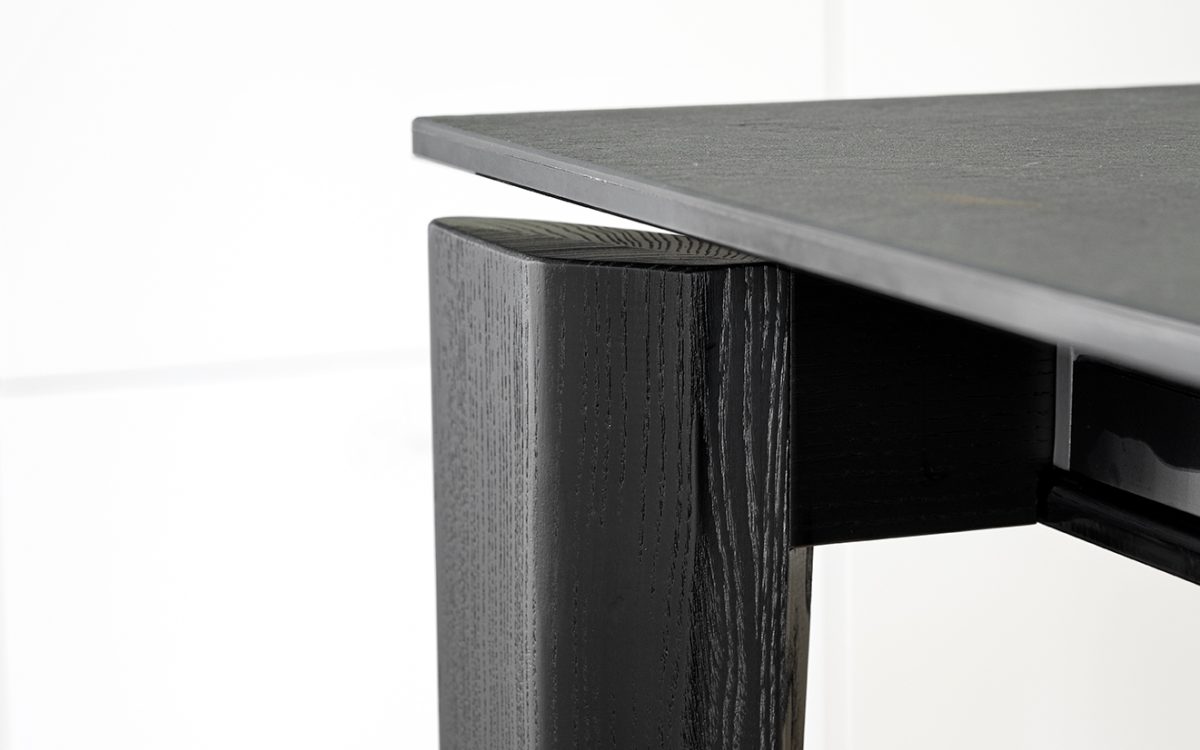 A masszív, mégis könnyed megjelenésű fa lábak többféle prémium kivitelben érhetők el – amerikai dió, füstölt tölgy és fekete kőris fafurnér -, így az asztal karaktere könnyen igazítható az otthon stílusához.
