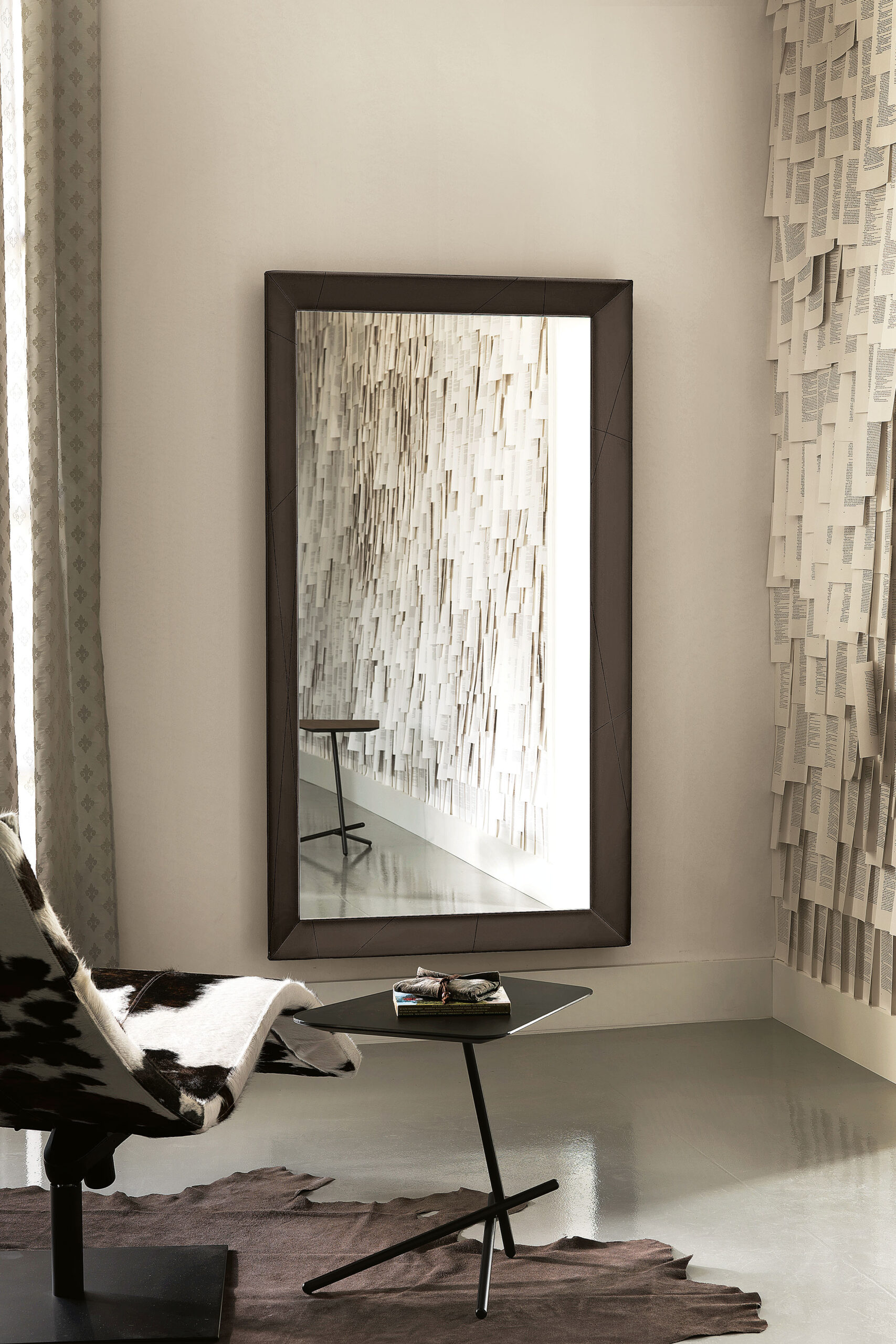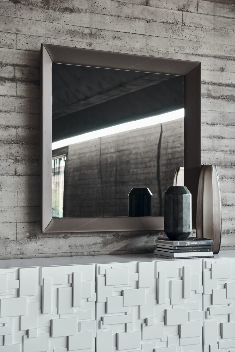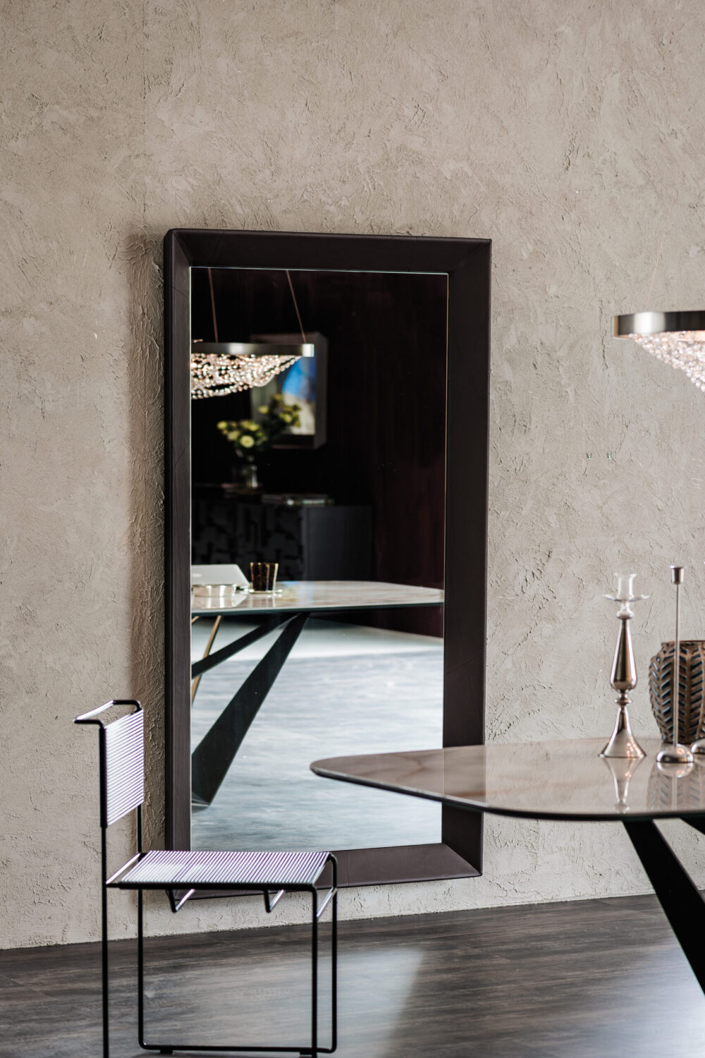 A TAXEDO modern tükörcsalád különleges megjelenésével azonnal kitűnik: kerete teljes egészében bőrrel vagy műbőrrel bevont, amelyet finom, átlós dísztűzések tagolnak. Ez a részlet gazdag textúrát és elegáns dinamizmust kölcsönöz a tükörnek, kontrasztot alkotva a tükörlap határozottan letisztult formájával. A több árnyalatban elérhető bőr- és eco‑bőr bevonatok között megtalálhatók a merész, élénk tónusok éppúgy, mint a harmonikus, visszafogott színek, így a Taxedo könnyen igazítható a modern, klasszikus vagy luxusenteriőrök hangulatához.