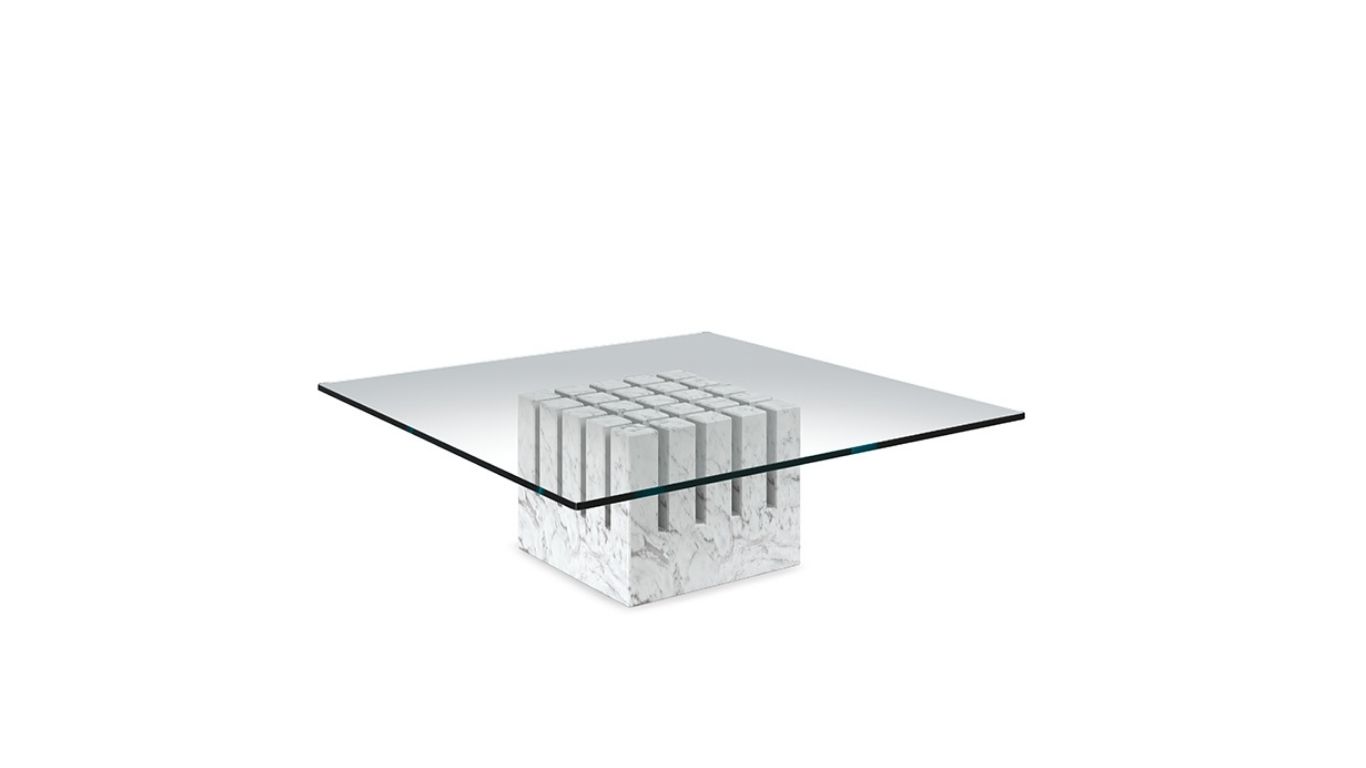 A SCACCO a márka egyik legrégebbi és legikonikusabb darabja: karakteres, szoborszerű üveg dohányzóasztal, amely egy modern nappali vitathatatlan főszereplőjévé válik. Látványának középpontjában a szenzációs, négyzetes márványtalp áll, amelyet a Made in Italy legkifinomultabb megmunkálási technikáival formáltak. A talp háromdimenziós, geometrikus reliefje távolról és közelről egyaránt magával ragadó — valódi kis építészeti objektum.