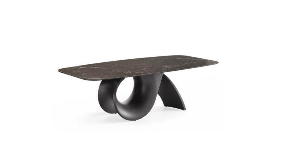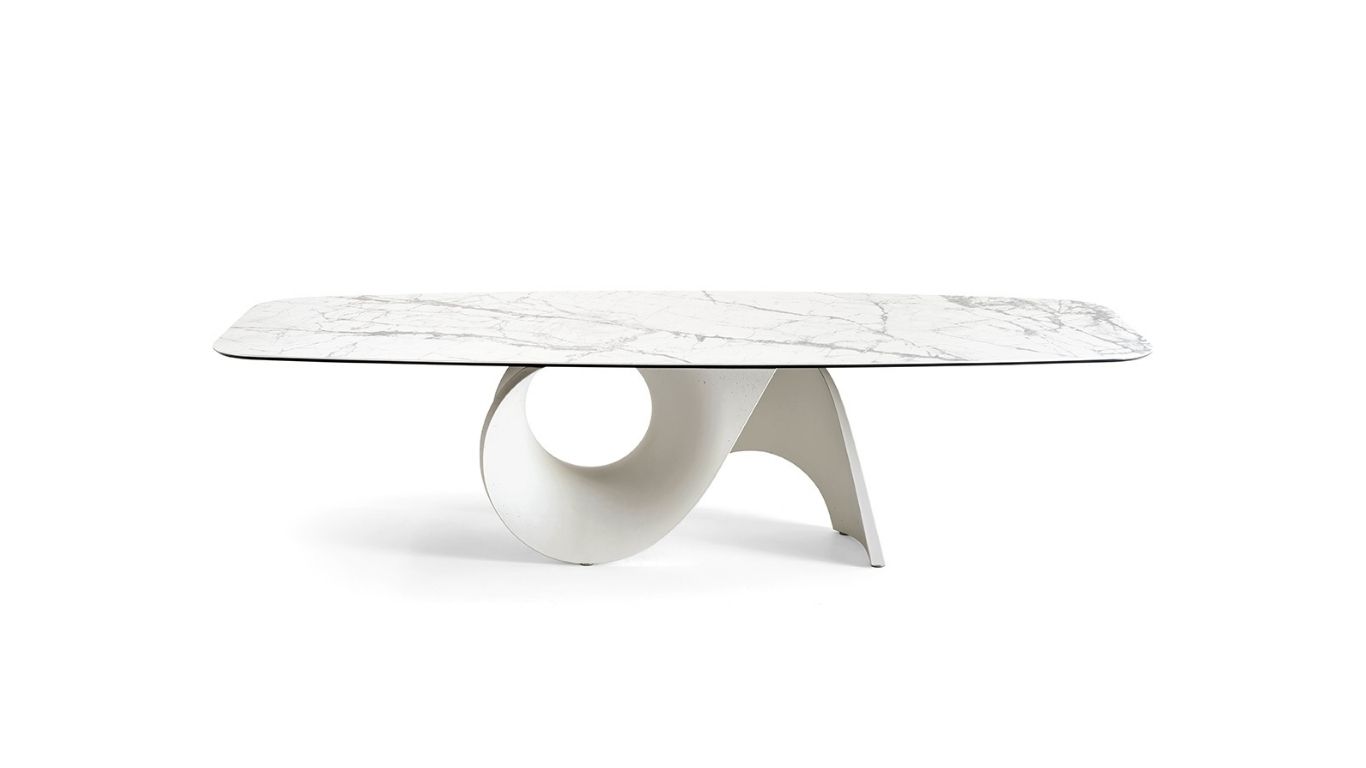 Az asztal eleganciáját tovább emeli az íves asztallap, amely üveggel vagy 8-féle kerámia asztallappal választható.
