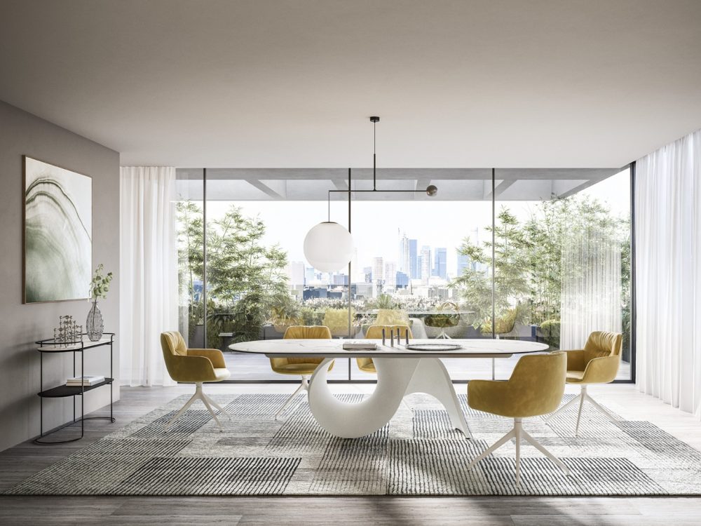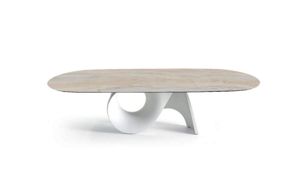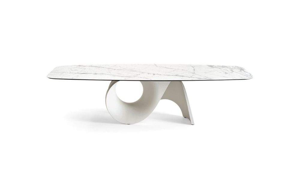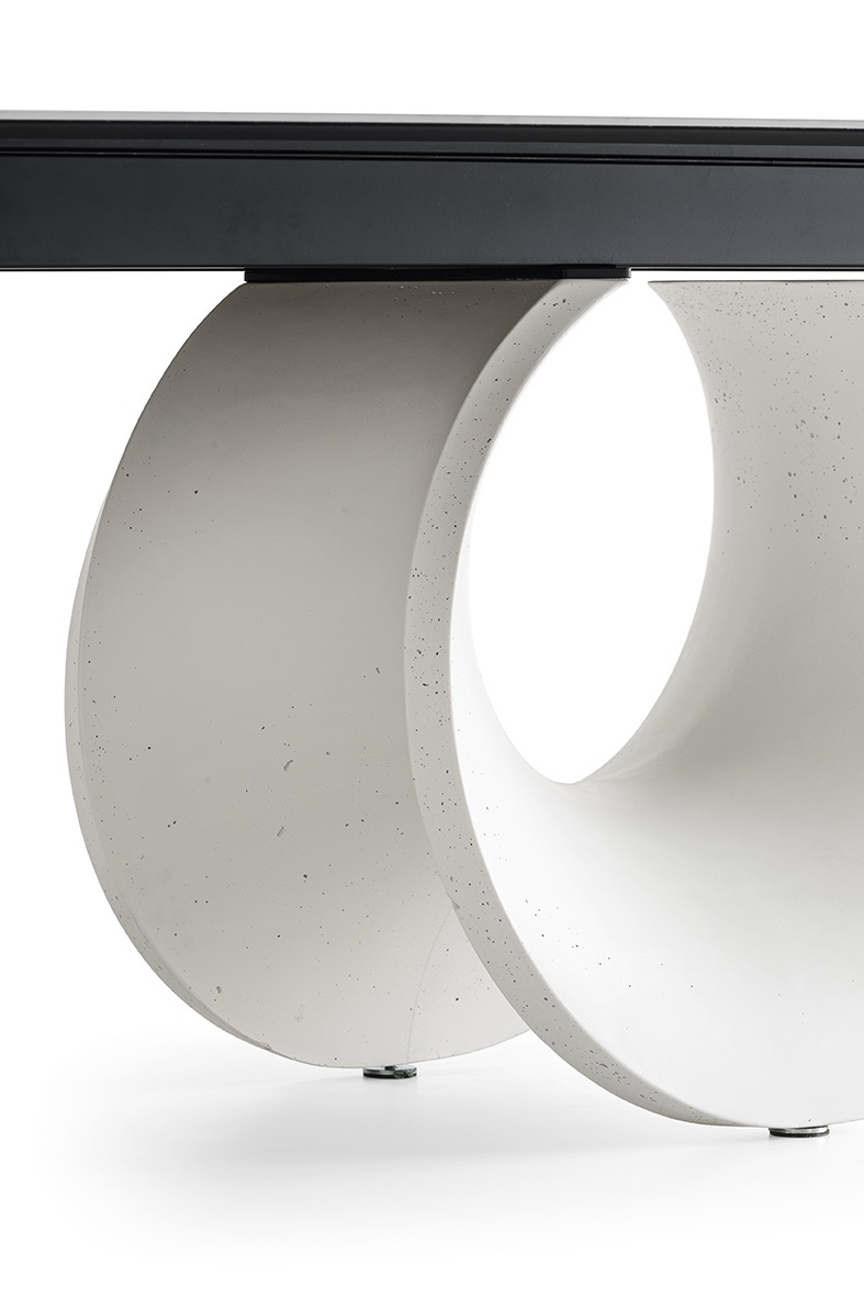 A központi talp organikus, lágyan ívelt sziluettje a természet formáiból merít inspirációt, különösen a kagylóhéjak görbületeiből, finom bordáiból és textúrájából. Az eredmény egy olyan geometria, amely egyszerre érzékeny és erőteljes: könnyedséget sugároz, mégis rendkívül stabil alapot biztosít. Formája nézőponttól függően folyamatosan változik, így az asztal minden oldalról új vizuális élményt nyújt.
