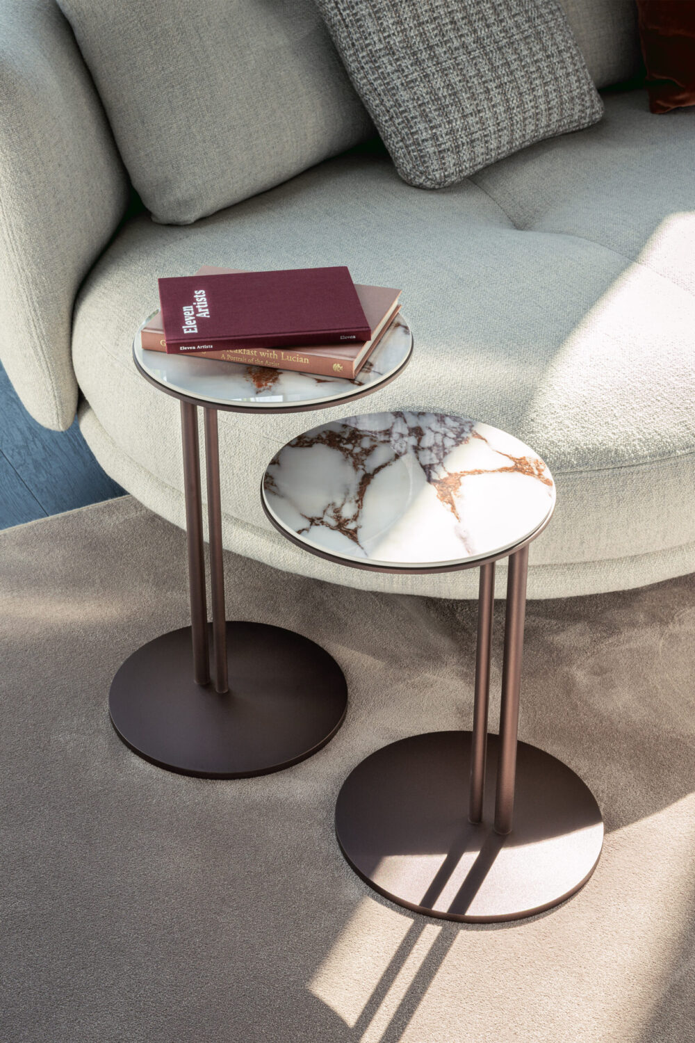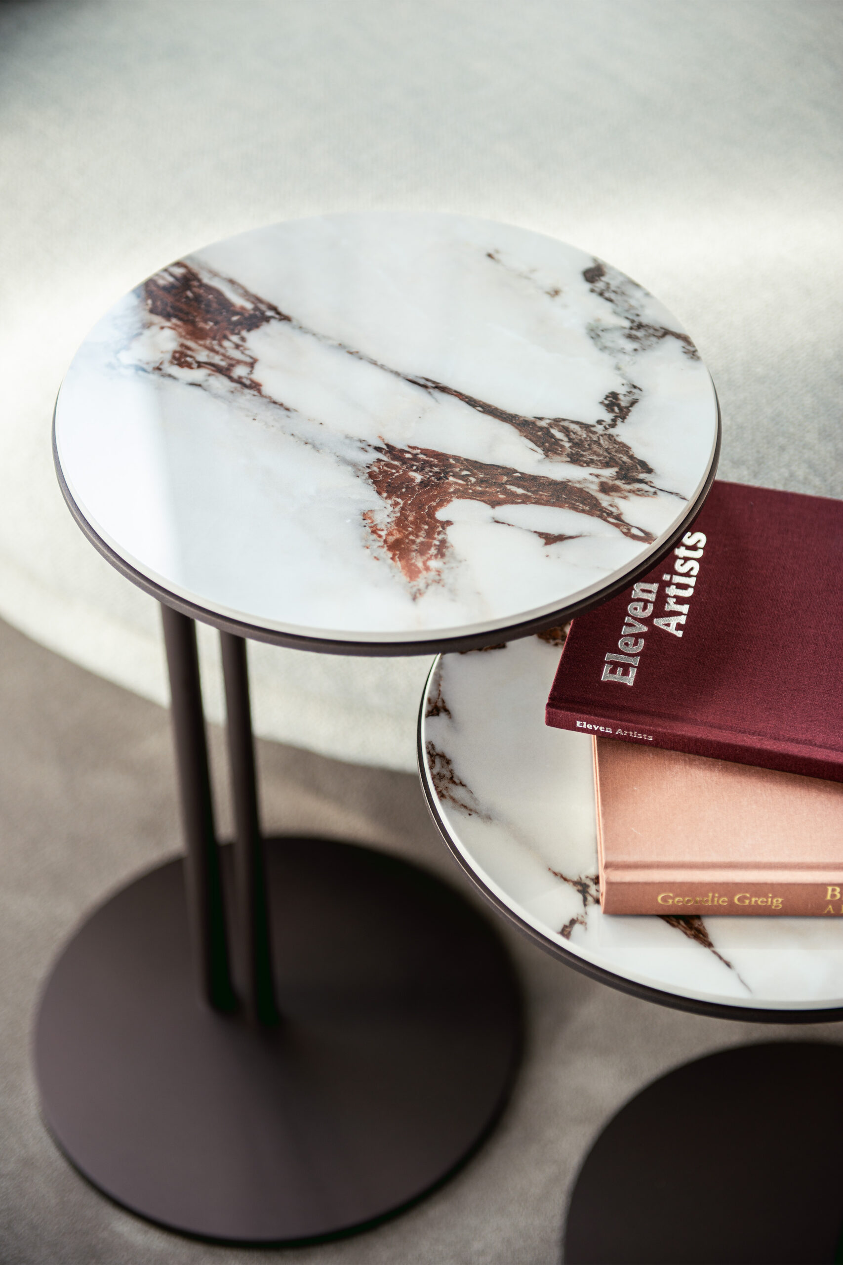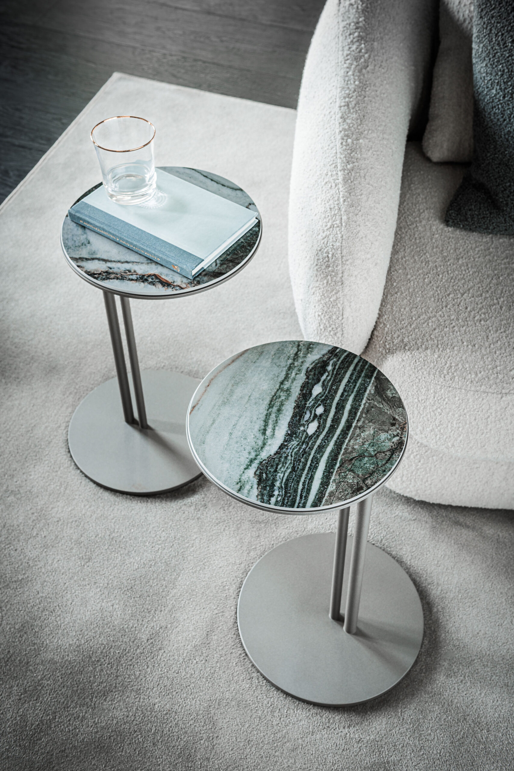 A designasztal acél talpa két különböző átmérőjű, karcsú fémlábból áll, amelyeket kézműves felületkezelések tesznek igazán különlegessé. A részletekben megjelenő finom textúrák tovább emelik az asztal vizuális értékét. A fém szerkezet matt fekete, bronz, titán, grafit és gyöngyház színben, az asztallap matt Portoro (KM07), fényes Portoro (KM08), Makalu (KM11), Breccia (KM12), Kaindy (KM16), Colosseo (KM21) és Taj Mahal (KM26) kerámiával választható.