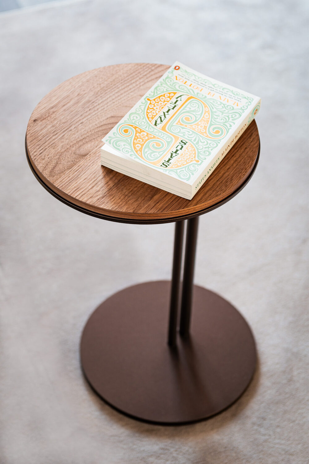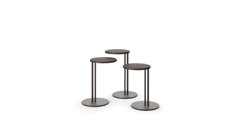 A kollekció jellegzetes geometriai könnyedsége megmarad: a karcsú acélváz két különböző átmérőjű lábbal készül, amelyet finom, kézi megmunkálású felületek tesznek különlegessé. A fémszerkezet légiessé, könnyen mozgathatóvá teszi az asztalt — így bármikor egyszerűen áthelyezhető a tér másik pontjára, ahol éppen szükség van rá.
